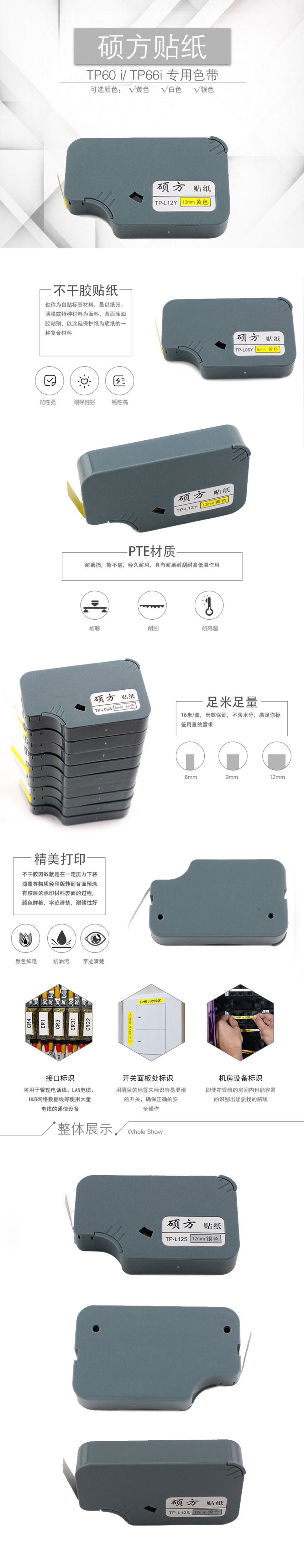 硕方线号机贴纸TP60系列包括TP60i、TP66i、TP60A、TP66A、TP60、TP66都通用。 线号机贴纸颜色有白色、黄色、银色三种颜色。 宽度分别有12mm、9mm、6mm。 每卷贴纸8米,色泽鲜艳,字迹清楚,耐候性