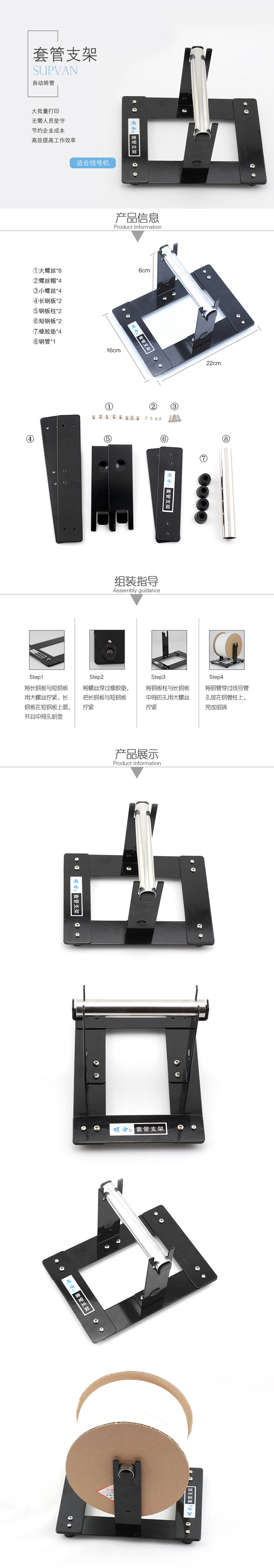 硕方线号管支架,专用于自动转动号码管。 自动转管,提高工作效率。 硕方品牌、佳能丽标品牌、凯标品牌线号机等都可配套使用。 自动穿号码管装置自动机能够实现自动穿号码管在自动印
