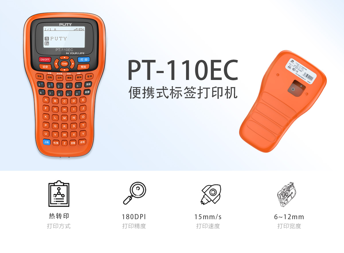 PT-110EC是一款便携热转印标签打印机,拥有自动剪切功能,使用TZ系列耗材,打印宽度可达6mm-12mm。最多可打印四行文字。针对电力电信做了多款标签模板和标识符号,采用三种方式供电,可随身携带进行工作。支持多标签一键打印。